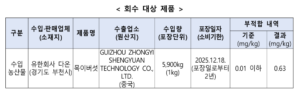 2026년 2월 6일, 식품의약품안전처는 수입업체 ‘유한회사 다온’이 중국에서 수입해 판매한 ‘목이버섯’에서 잔류농약(카벤다짐)이 기준치(0.01mg/kg 이하)를 초과해 검출됨에 따라 해당 제품의 판매를 중단하고 회수 조치한다고 밝혔습니다.